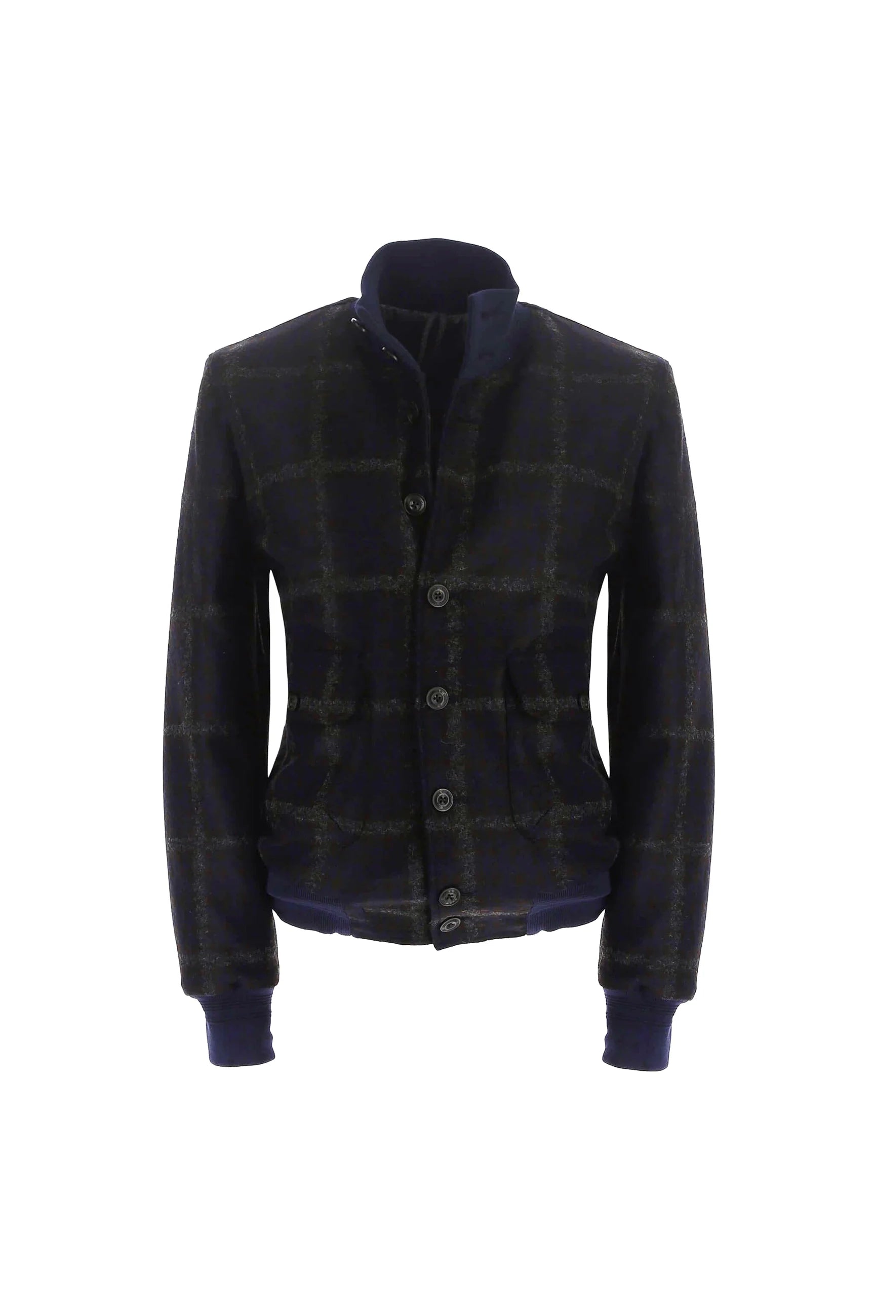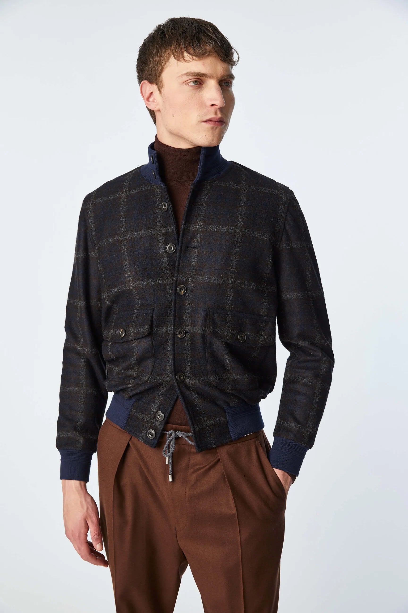L.B.M. BOMBER JACKET IN JERSEY WITH KNIT COLLAR AND CUFFS IN A GRAY BROWN WINDOWPANE PATTERN